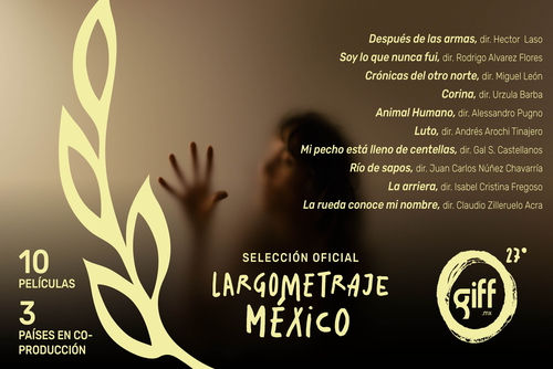 En Largometraje México participan “Soy lo que nunca fui” (Rodrigo Álvarez Flores); “Crónicas del otro norte” (Miguel León); “Animal humano” (Alessandro Pugno); “Luto” (Andrés Arochi Tinajero); “Mi pecho está lleno de centellas” (Gal S. Castellanos); “Río de sapos” (Juan Carlos Núñez Chavarría); “La rueda conoce mi nombre”(Claudio Zilleruelo Acra); “Corina” (Urzula Barba); “Después de las armas” (Héctor Laso); y “La arriera” (Isabel Cristina Fregoso).