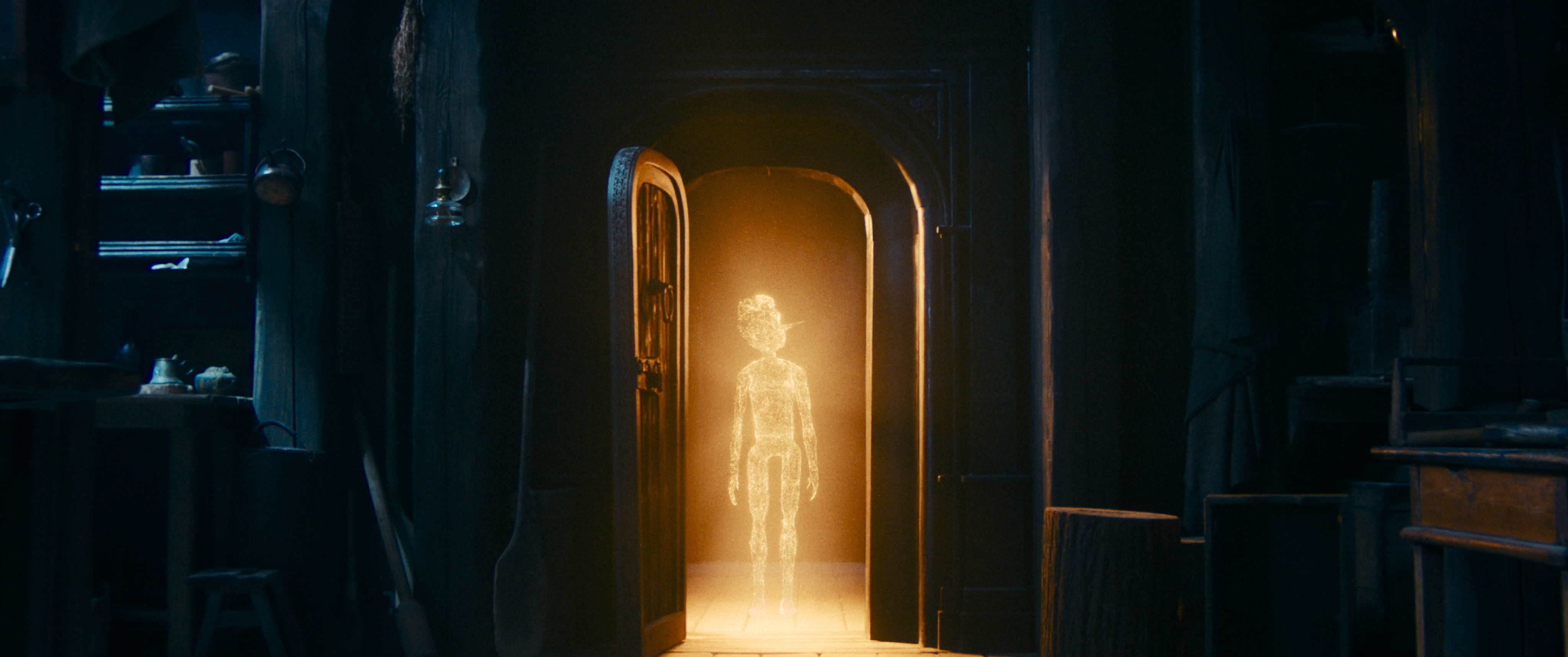 Acto seguido, aparecen unas lucecitas las cuales buscan darle forma a ese deseo, y se alojan en un tronco que el carpintero tiene arrumbado en casa, otorgándole la vida. Al darse cuenta de ello, el artesano construye con él un muñeco de madera quien no es otro sino el personaje principal, el cual aquí es creado digitalmente y cuya voz es provista por la joven actriz Vitaliya Korniyenko.