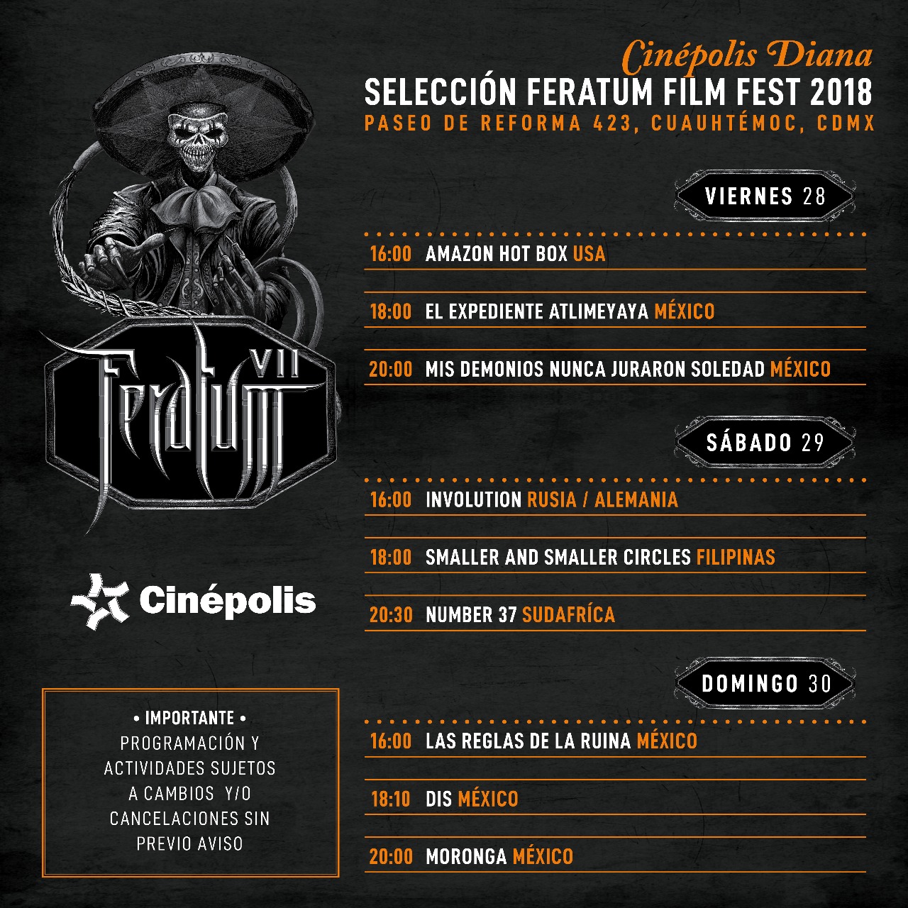 Del 28 al 30 de septiembre, se podrán ver tres películas por día en el Cinépolis Diana. Las películas que podrán disfrutar durante estos tres días serán: "Mis demonios nunca juraron soledad", de Jorge Leyva, western a la mexicana que combina leyendas de Sonora con chamanes, brujos y hechiceros, ganadora del premio Alucarda a la Mejor Película de Terror, así como del Nosferatu de Bronce a la Mejor Película Mexicana del 2018, y de los reconocimientos al Mejor Director, Mejor Guión, Mejores Efectos Especiales y Mejor Actriz; y "Moronga", de John Dickie, retrato acerca del malestar social con tintes surrealistas, que se llevó los premios a la Mejor Fotografía para Juan Pablo Ramírez, la Mejor Música Original, para el equipo de músicos y compositores Steven Brown, Juan García y Juan Pablo Toch “Moronga”, la Mejor Dirección de Arte para Álex Martínez y Jonathan Barbieri y al Mejor Actor para José Sefami “Moronga”.