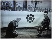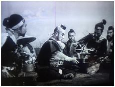 Comenzamos viendo cómo el administrador de la barrera retira a los guardias y empieza una conversación con Benkei. En el plano se puede observar la igualdad que tienen estos dos personajes durante la charla y como el guía quién está detrás de Benkei está escondiéndose o más bien a la flor quien viene siendo Yoshitsune, del otro lado está el mensajero del emperador, quien no deja de acechar para desentrañar lo qué está pasando (7).
