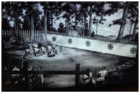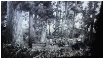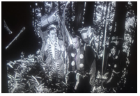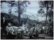 En la primera escena se nos plantea el contexto de la película mediante rótulos. Yoshitsune está huyendo con sus seis guardias disfrazados de monjes de la conspiración creada en su contra la cual busca culminar con su muerte bajo la mano de su hermano, el actual emperador. Comenzamos observando el bosque (1) de tal manera que nos crea la metáfora de ser barrotes de una cárcel en la cual los personajes están encerrados y con un suave travelling a la izquierda observamos que por el camino que van los personajes no hay más que estos asfixiantes árboles aprisionándolos. También este travelling se puede llegar a entender cómo el inicio de la travesía por sacar a Yoshitsune de tan peligrosa situación y el secreto de no ser monjes si no guardias. Los árboles colocados desde en un plano nadir resultan amenazantes (1.1), creando la sensación de no recibimiento hacia los personajes. Al plantearnos los personajes, podemos observar una clara antítesis entre los monjes (guardias de Yoshitsune) y el guía (1.2), ya que estos son vigorosos físicamente y serios de personalidad, mientras el guía es delgado y pequeño en físico pero con una personalidad carismática.