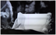 Benkei abre un pergamino en blanco, el cual nos llama por su ausencia de contenido más que por tener algo escrito (6.2), al empezar a “improvisar” el contenido en el pergamino, el mensajero del emperador comienza a sospechar y nuevamente a asechar en este caso a Benkei asemejándose a un tigre acechando a la presa (6.3), ante esto, todos los “sacerdotes” se ponen en alerta pero deciden no actuar, siendo Benkei quien aleja a esta amenaza con una hipérbole de sus facciones faciales en primer plano (6.4).