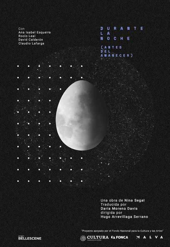 Basado en la obra de la dramaturga Nina Segal (con traduccio?n de Daria Moreno Davis), quien la escribió pensando en dos actores para interpretarle y que en manos de Arrevillaga se convierte en una retorcida puesta en escena con cuatro actores que interactúan todo el tiempo entre ellos, creando la imagen real e imaginaria de cada pareja, dando una agilidad brutal y que todo el tiempo confronta al espectador, no sólo por el texto sino porque la particularidad del Foro Primera Fila del Foro Bellescene es la de poner al espectador prácticamente al borde del escenario, lo que hace que las emociones se perciban de una manera muy violenta. "Durante la noche (antes del amanecer)" cuenta con la actuación de Ana Isabel Esqueira, Rocio Leal, David Calderón y Claudia Lafarga, cómplices de Hugo Arrevillaga en esta ocasión.